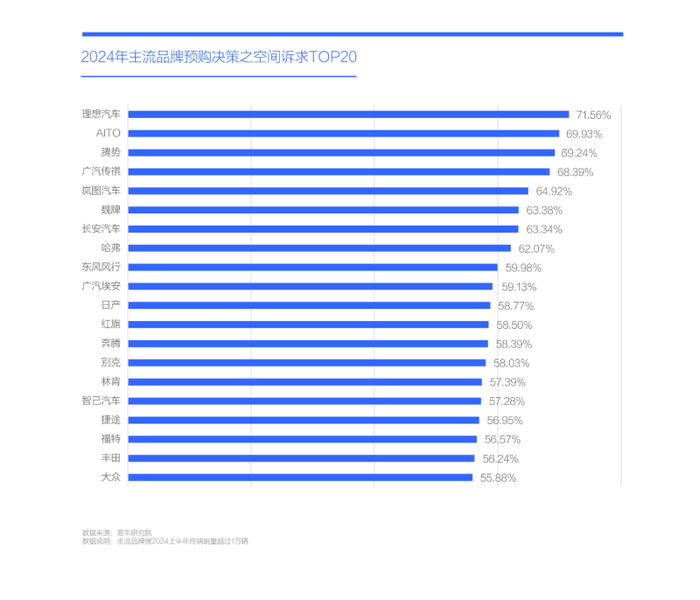 2024年理想、问界、腾势等一大批主打大空间的中国高端品牌,引领预购主流品牌的空间诉求排行榜,并率先尝到大叔红利
