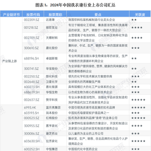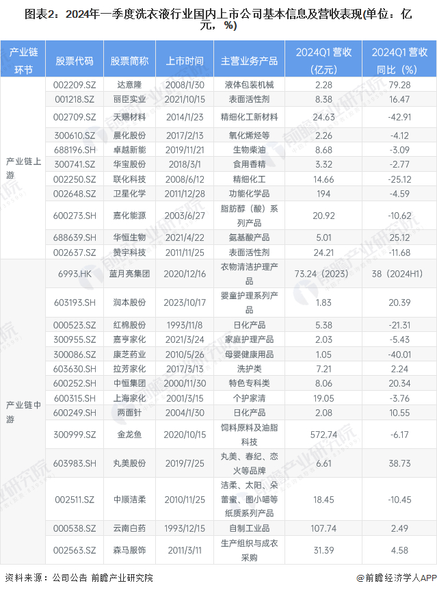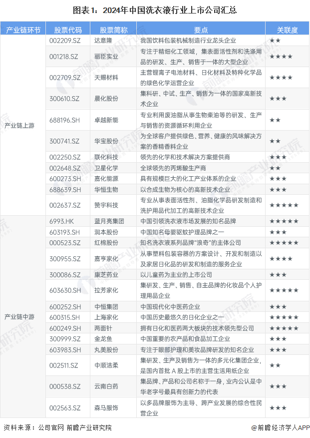 洗衣液行业作为2009年开始爆火的行业,经过近几年的快速发展,已经深深融入到居民的日常生活中。目前,我国洗衣液相关企业大多是由之前化工品生产、日化品制造转型而来,经过筛选,截止2024年7月25日相关产品名称包含洗衣液的国内上市企业有24家,香港上市企业1家。其中,产业链上游主要是为洗衣液生产提供表面活性剂和整合剂、酶制剂、增稠剂等助剂的化工企业,主要上市公司有丽臣实业、天赐材料、嘉化能源等;产业链中游是洗衣液制造、销售的厂商,这些企业有主营日化用品的蓝月亮集团、嘉亨家化、上海家化、赞宇科技等,也有在主营业务之外布局洗衣液产品的红棉股份、两面针、金龙鱼、云南白药等。
