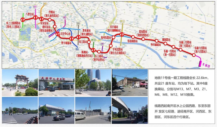 地铁11号线一期工程是天津市地铁线网的重要一环,西起南开区水上公园西路站,东至东丽区东丽六经路站,全长22.6公里,共设21座车站。线路途经天开园、八里台、文化中心、新八大里、陈塘商务区、海河柳林设计之都、东丽开发区等多个重要区域,是实现中心城区与海河中游地区连通的重要通道。该线路东段从东丽区东丽六经路站到河西区东江道站共11座车站,已作为去年民心工程于2023年12月28日建成通车。西段南开区水上公园西路站至东江道站(不含)共10座车站10区间,又被列为今年的20项民心工程之一。地铁11号线西段车站连接了文化、教育、医疗、商业等重要场所,提高了周边居民生活质量和出行效率。南开大学八里台站出站可抵达南开大学东大门、佟楼站和医大二院站可方便就医、文化中心站给群众休闲活动提供便利、内江路站和陈塘站可以服务于新八大里和陈塘商务区,连通四里商业区,为市民购物消费提供了便捷通道。11号线西段换乘站较多,吴家窑站可与既有3号线换乘,文化中心站未来可与5、6号线换乘,医大二院站与6号线换乘;八里台站未来可与7号线换乘,澧水道站未来与8号线实现换乘。