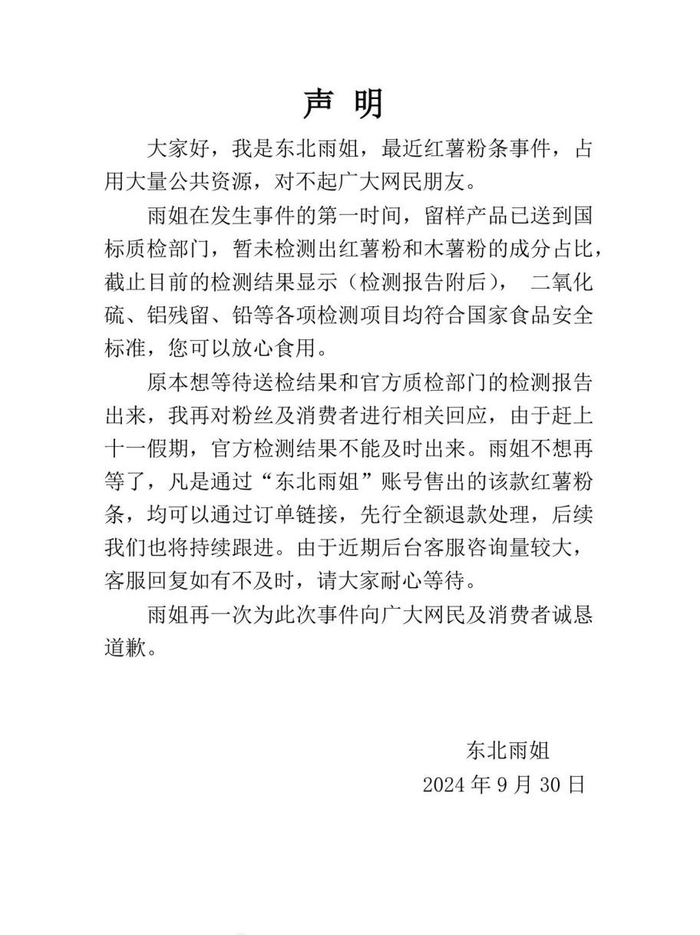 声明中还提到,由于赶上十一假期,官方检测出结果不能及时出来,凡是通过“东北雨姐”账号售出的该款红薯粉条,均可以通过订单链接,先行全额退款处理。