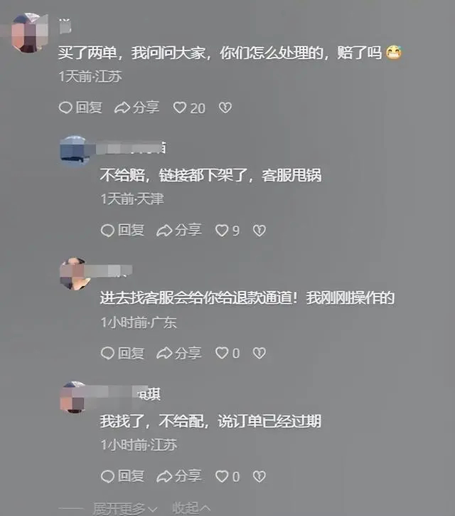 但目前退款似乎没有完全落实到位,有网友在评论区反映,购买的红薯粉条并未得到赔偿,不仅相关链接已被下架,还会遭遇以订单过期为由拒绝退款的情况。