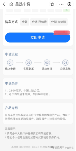 具体来说,在支付宝首页搜索“星选车贷”,页面该产品是“由蚂蚁星河(重庆)信息技术有限公司与合作伙伴共同推出的产品,为用户推荐优质的车辆融资服务,融资服务由持牌机构提供”。