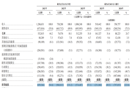 报告期内,其净利润分别亏损28.12亿元、23.83亿元、8亿元、11.21亿元,合计亏损71.16亿元。同时,今年上半年的营收较去年同期下滑:2024年上半年,其营业收入为3.57亿元,较上年同期的5.10亿元下降约30%。