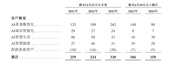 虽然如上文所述,每年特斯联都有不少的新签约客户,但是,客户的总体数量却在下降。报告期内,客户数量分别为259个、224个、330个、186个及150个。