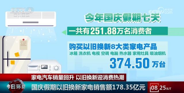 记者从商务部了解到,今年国庆假期七天,一共有251.88万名消费者购买以旧换新8大类家电产品374.50万台,销售额达到178.35亿元。自家电以旧换新政策实施以来,已经有超823.8万名消费者购买8大类家电产品1177.98万台,带动销售超557.93亿元。
