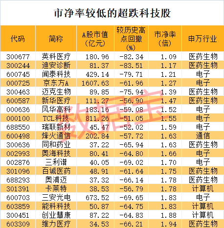 数据宝以电子、计算机、通信、医药生物四大行业为主,剔除ST股后,通过以下条件梳理出超跌严重的科技股名单。
