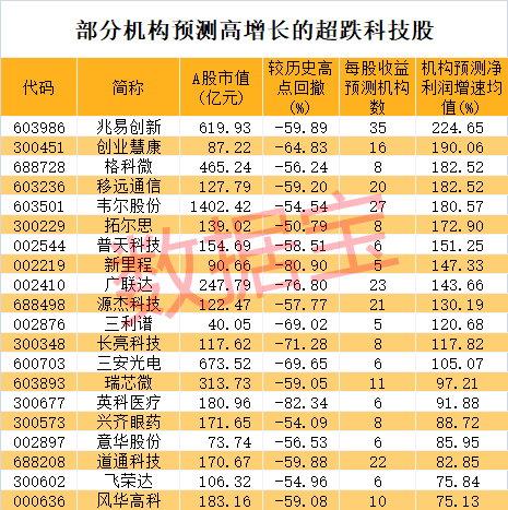 据数据宝统计,共88股入围。这些股票当中,机构一致预测今后三年净利润增速均值在100%以上的有13只,包括兆易创新、创业慧康、格科微、移远通信、韦尔股份等。