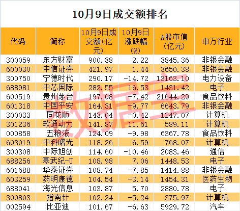 券商龙头之一东方财富今日成交额突破900亿元,夺下成交额冠军,并创下A股单日成交额新纪录。该股今日盘中最高涨幅超19%,创下历史新高,收盘涨幅回落至2.22%。