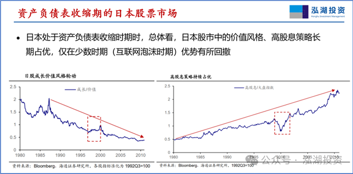 从这两张图里,我们可以直观地看出:日本处于资产负债表收缩时期时,总体看,日本股市中的价值风格、高股息策略长期占优,仅在少数时期(互联网泡沫时期)优势有所回撤。