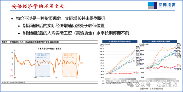 虽然安倍执政时期采取了相当多的政策以刺激经济,但日本GDP的实际增速、也就是剔除通胀后的增速,依然处在非常低的水平,2013~2019年之间,GDP的实际增速平均只有0.9%。