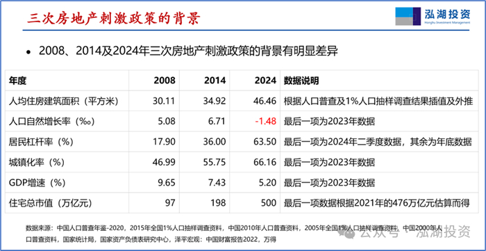 三次大的房地产政策转向所对应的经济背景有非常巨大的差异。人均住房建筑面积、人口自然增长率、居民杠杆率、城镇化率、GDP增速、住宅总市值这些基本指标可以用来刻画政策调整时的背景。由于2024年时的这些指标与2014年、2008年有着很大的差异,因此,本轮政策调整的结果可能也会有比较显著的差异。