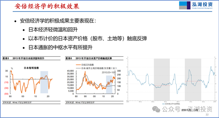 “安倍经济学“的实施,阻止了日本经济滑向长期负增长的窘境;另外,日本的通胀水平也有所回升,并且还制造了以日元计价的资产价格,包括股票、土地等的大幅反弹。