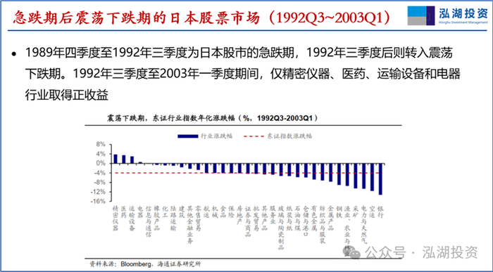 而在急跌期结束后的震荡下跌期里,日本仅有少数细分行业跑出了正收益。