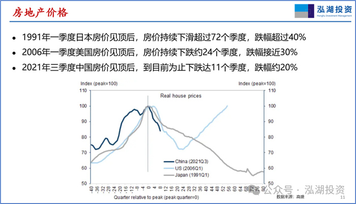中国房价见顶后,到目前为止下跌了约11个季度,跌幅约20%,看似时间很长、幅度很深,但跟海外的一些大级别调整比,下跌的时间和幅度并不算极端,例如,1991年一季度日本房价见顶后,房价持续下滑超过72个季度,跌幅超过40%;2006年一季度美国房价见顶后,房价持续下跌约24个季度,跌幅接近30%。