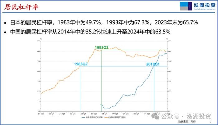 从图中可以看出,日本的居民杠杆率的见顶时期基本与日本房地产的见顶时期同步,大致在70%处见顶,之后总体呈现震荡状态。中国的居民杠杆率在2024年中时为63.5%,上升空间已相当有限,并且考虑到中国广大的农村人口难以获得信贷支持,因此当前的居民杠杆率水平可能相当接近上限。