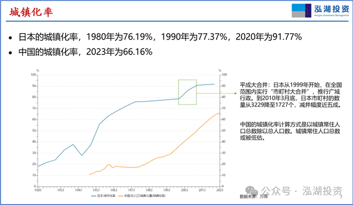 日本的城镇化率已超过九成,这里有统计口径改变的因素,即所谓的“平成大合并”,日本从1999年开始,在全国范围内实行“市町村大合并”,推行广域行政。到2010年3月底,日本市町村的数量从3229降至1727个,下降幅度近五成。因此,1999年及之后城镇化率的快速增长仅仅是统计口径改变造成的。因此,假设没有统计口径的变化,日本城镇化率的终点可能落在75至80%之间;以此区间为参照,中国城镇化率的上升空间已经比较小。