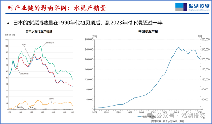 以水泥为例,日本的水泥产销量在1990年代初见顶后,到2023年时已下滑超过一半,而中国的水泥产量也较顶峰时下滑了约两成。