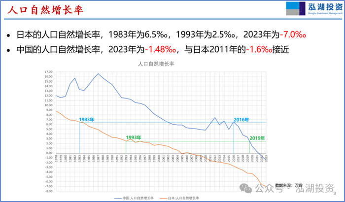 而日本的1980年代和1990年代的人口自然增长率均为正数,与当前中国的负数不同,因此,不能用日本的1980年代或1990年代来直接对比当前国内的状态。