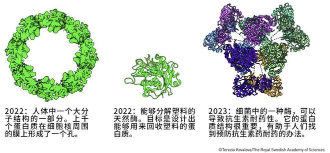 戴密斯·哈萨比斯与约翰·朱默帕使用他们AI模型AlphaFold2,计算了所有人类蛋白质的结构,并预测了目前已知的地球生物共2亿种蛋白质的结构。Google DeepMind公开了AlphaFold2 的代码,到2024年10月,190个国家的200多万人使用了 AlphaFold2。图片中为AlphaFold2帮助研究人员的例子。