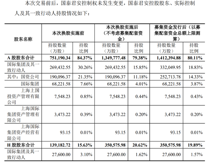 以本次募集配套资金总额上限测算,发行A股股票募集配套资金后,国泰君安的总股本将进一步增至17629708696股。国际集团直接及间接控制国泰君安的股份数量增加至3596499533股,占总股本的20.40%。交易前后,国泰君安控制权未发生变更。