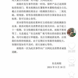 “东北雨姐”解释,原本想等待送检结果和官方质检部门的检测报告出来再回应粉丝及消费者,由于赶上十一假期,官方检测结果不能及时出来。凡是通过“东北雨姐”账号售出的该款红薯粉条,均可以通过订单链接,先行全额退款处理。
