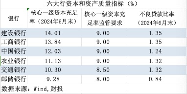 截至今年6月末,建行、工行、中行、农行、交行、邮储六大行的核心一级资本充足率分别为14.01%、13.84%、12.03%、11.13%、10.3%、9.28%。其中建行、工行高出监管线4.8个百分点以上,中行、农行分别高出监管线3个、2个百分点,交行、邮储银行高出监管线1.8、1.28个百分点。