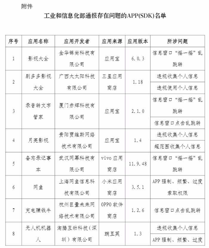 据了解,依据《个人信息保护法》《网络安全法》《电信条例》《电信和互联网用户个人信息保护规定》等法律法规,工信部持续整治APP侵害用户权益的违规行为。对违规述APP及SDK,工信部要求其应按有关规定进行整改,整改落实不到位的,将依法依规进行相关处置。
