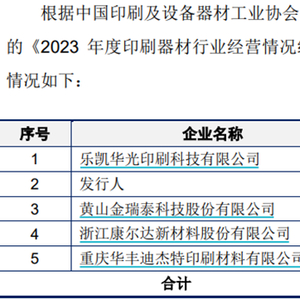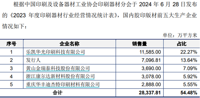 印刷版材是个市场竞争格局较为集中的行业,领先企业占据的市场份额较高。胶印版材方面,根据中国印刷及设备器材工业协会印刷器材分会数据显示,2023 年我国胶印版材前三大生产企业的销量合计为2.24亿平方米,前五大生产企业的销量合计为2.83亿平方米,占我国胶印版材同期总销量的比重(CR3、CR5)分别达到 43.01%与54.48%。