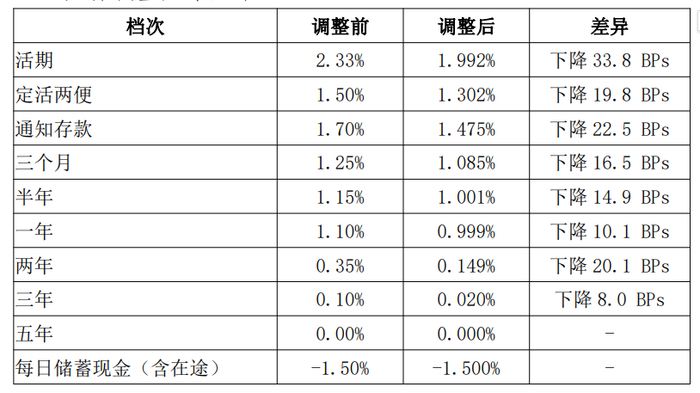 按照协议,邮储银行按照“固定费率、分档计费”的原则,计算代理吸收个人存款业务储蓄代理费,即针对不同期限储蓄存款分档适用不同的储蓄代理费率。而此次调整,各档次的调整幅度不一,综合测算下来,代理费综合费率由 1.24%下降至 1.08%。