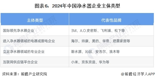 从中国净水器企业主体类型来看,国内净水器市场现阶段主要被四类企业占据:一是全球性企业,包括3M、A.O.史密斯等;二是进入净水器领域的电器或厨电企业,包括美的、海尔、帅康等;三是立足净水器领域的专业企业,包括碧水源、沁园、安吉尔、浪木等;四是依托互联网供应链进入净水器领域的小米、京东京造、华为等企业。