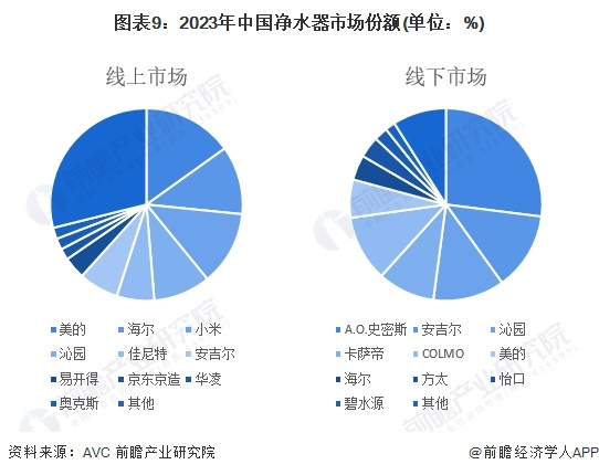 从市场份额集中度来看,中国净水器线上及线下市场均较为集中,线上市场CR10集中度超过70%,线下市场CR10更是超过90%。由此可见,中国净水器竞争格局逐渐趋于稳定。