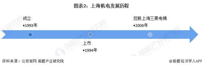 上海机电股份有限公司原名上海上菱电器股份有限公司,是1993年7月29日经上海市经济委员会以沪经企字第331号文批准设立的股份有限公司。1994年2月24日,公司在上海证券交易所上市。2006年,公司出资控股上海三菱电梯有限公司,持股比例52%,上海三菱电梯有限公司是其电梯业务的制造经营中枢。具体发展历程如下: