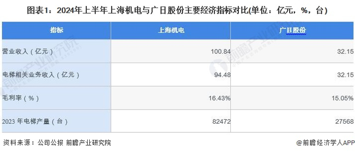 上海机电和广日股份是中国电梯行业领先的本土厂商。从业务收入来看,上海机电2024年上半年电梯相关业务收入约94.48亿元,相对较高;从毛利率来看,上海机电2024年上半年毛利率约16.43%,广日股份为15.05%;从产量来看,2023年上海机电电梯产量约82472台,广日股份约27568台。