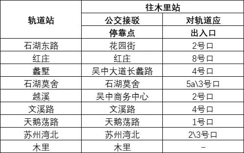 往木里站方向,花园街(轨道石湖东路站2号口)、红庄(红庄8号口)、吴中大道长蠡路(蠡墅4号口)、石湖莫舍(石湖莫舍5a\3号口)、吴中商务中心(越溪2号口)、文溪路(文溪路4号口)、天鹅荡路(天鹅荡路1号口)、苏州湾北(苏州湾北2\3号口)、木里。