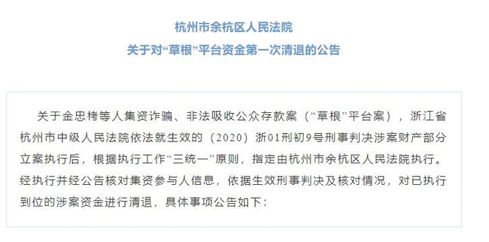 近日,杭州市余杭区人民法院发布《关于对“草根”平台资金第一次清退的公告》,公告称,已对金忠栲等人集资诈骗、非法吸收公众存款案(“草根”平台案)的涉案财产进行执行,依据生效刑事判决及核对情况,对已执行到位的涉案资金进行清退。