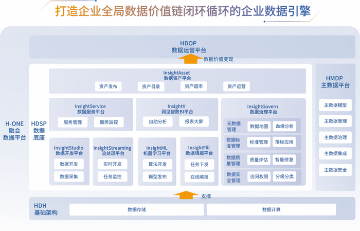 H-ONE融合数据平台包含四大一级平台,包括基础架构Hadoop发行版HDH、数据服务平台HDSP、主数据管理平台HMDP、数据运营平台HDOP。八大二级平台,数据开发平台InsightStudio、流处理平台InsightStreaming、机器学习平台InsightML、数据填报平台InsightFill、数据治理平台InsightGovern、数据资产平台InsightAsset、数据服务平台InsightService、洞见智数BI平台InsightV。