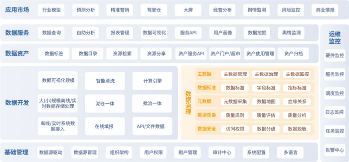 通过构建数据集市(数据湖)集中存储和管理数据、数据仓库(模型)提供统一的数据访问点,以及API等各类数据资产功能,帮助企业进一步完成数据资产盘点,同时让数据被企业轻松获取。