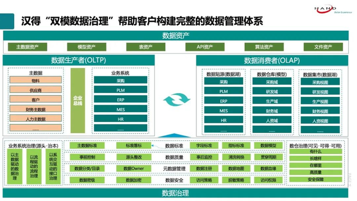 汉得提出业务前端+数据后端“双模数据治理”模式,主张数据治理并不是单纯只为“治理”而“治理”,其根本还是要回归到业务本身,在业务前端从源头进行治理,在数据后端为业务进行赋能,最终实现数据价值的释放。