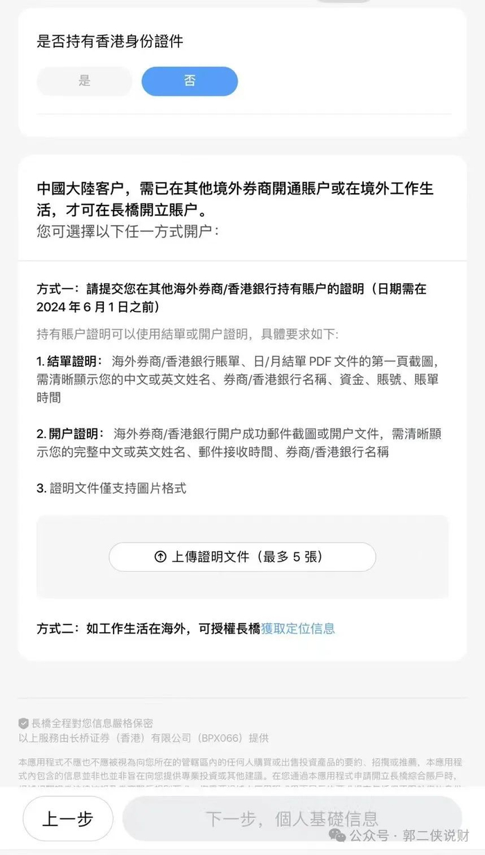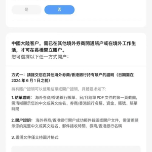 中国大陆客户人在中国大陆,选择方式一,开户需上传投资者存量证明,即本人名下2024年6月1日之前的港股券商或香港银行账户结单截图。