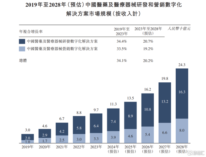 由于产业发展的逻辑和驱动力相似,中国市场的发展轨迹与美国过去的趋势相似。随着中国的医药及医疗器械行业成为全球第二大市场,行业数字化需求也在快速增加。灼识咨询的分析指出,2023至2028年,中国医药和医疗器械的研发数字化市场将显著扩张,市场规模预计从64亿元增长到163亿元,年复合增长率为20.7%。同时,营销数字化市场也将快速增长,市场规模预计从33亿元增长到80亿元,年复合增长率为19.2%。