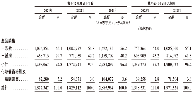 毛戈平的收入主要来自销售美妆产品,包括彩妆产品、护肤产品。彩妆产品主要包括粉底、高光和修容、唇妆及眼妆;护肤产品主要包括面霜、眼部护理、面膜、精华液和洁面乳等。截至2024年6月30日,毛戈平的产品组合包括涵盖两个类别的378个单品。此外公司还提供化妆艺术培训及相关销售。