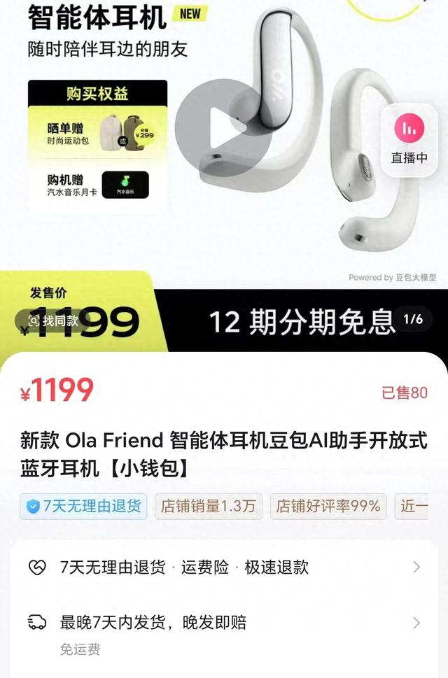 从销量来看,目前这款耳机的声势显得颇为低调,截至中午12时,抖音旗舰店Ola Friend预售销量为80件,京东、淘宝销量同样没有破百。