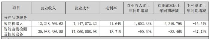 同时比较另一主营业务——智能监测检测及控制设备,在营业收入与营业成本都同比大幅减少的情况下,毛利率也相应出现大幅下滑,同比减少了37.72%。