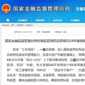 蓝鲸新闻10月10日讯(记者 金磊)据财联社消息,10月7日,国家金融监管总局安徽监管局发文,具体内容为抓实抓细2024年徽商银行负债业务与资产匹配性专项检查。