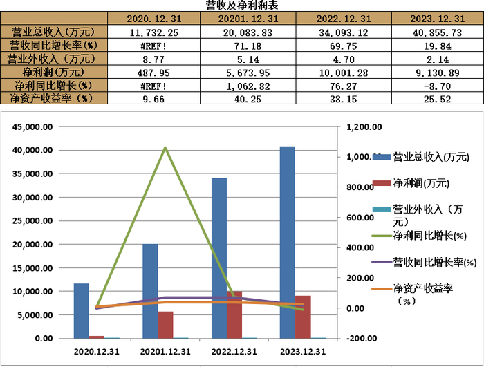 业绩情况:2020-2023年底,公司的营业收入分别为11732.25万元、20083.83万元、34093.12万元、40855.73万元;归母净利润分别为487.95万元、5673.95万元、10001.28万元、9130.89万元。