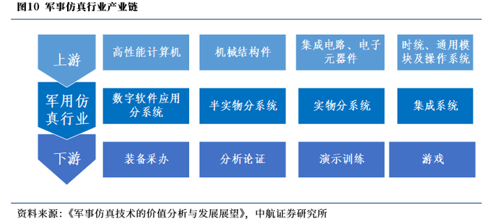 军事仿真行业属于信息传输、软件和信息技术服务业,行业的上游行业主要为计算机、计算机软件以及电子元器件制造业。军方的下游行业是军事仿真行业的目标市场,产业链条如下: