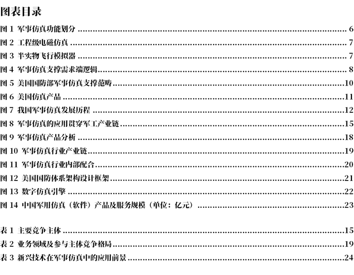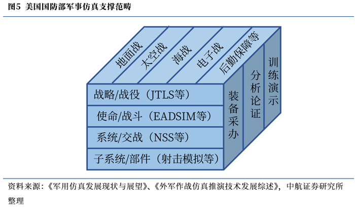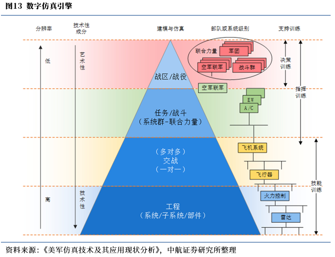 ③数字仿真引擎,军事仿真的核心。是针对客户需求,以军事理论要素为基础所开发的虚拟现实和数据应用系统。该类系统通过构设虚拟战场空间,模拟对抗双方兵力和作战行为,在近似真实的数字环境中,研究战争、预知战争、培训作战人员与装备,侧重于定量分析。客户定制化程度较高、产品软件占比较高是数字仿真引擎的突出特点。数字仿真引擎按颗粒度及侧重可以划分为战役级、任务级、交战级、工程级、多层级虚实融合平台及严肃训练游戏。