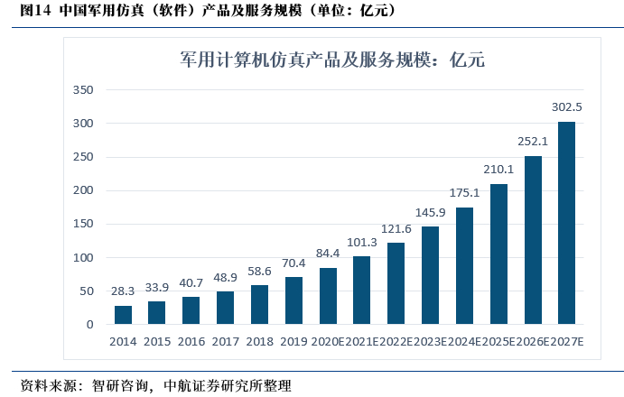世界各国均开始逐步认识到军用仿真在军事领域的显著作用,全球2025年军用仿真投入经费总额将达到150.07亿美元,考虑我国现代化国防能力建设的深入以及新质新域作战力量的重点发展,参考世界领先水平(占比20%,北美占比36.19%),对应2025年我国军用仿真市场空间上限为30.01亿美元,折合人民币210.10亿元人民币,未来随着我国国防信息化的不断深入,我们认为,软件能力建设有望提速,行业公司享受中国军费总量增长、结构变化、及国防信息化软实力建设三重动能加持,预计CAGR有望维持20%的增长,到2027年行业市场规模上限有望达到302.50亿元。