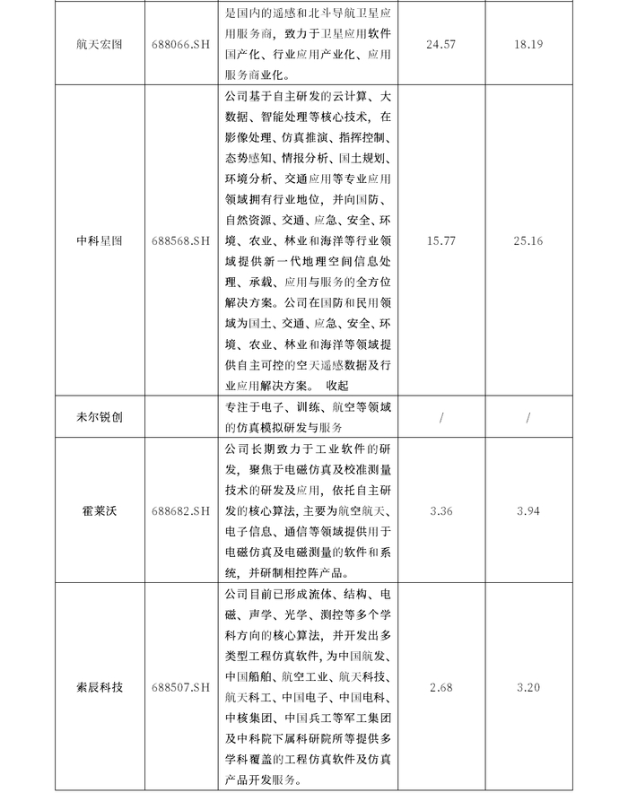 中科星图(688568.SH)、霍莱沃(688682.SH)、索辰科技(688507.SH)、润科通用(经纬恒润688326.SH)、华力创通(300045.SZ)、中仿智能(838676.NQ)、摩诘创新(海格通信002465.SZ)、展鹏科技(603488.SH)、北斗院(A23086.SH)、六九一二(A22323.SZ)、赫尔墨斯(872720.NQ)、星网宇达(002829.SZ)、威海广泰(002111.SZ);