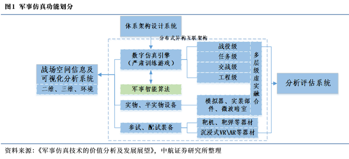 从功能用途上划分,军事仿真产品主要由体系架构设计系统、战场空间信息及可视化分析系统、数字仿真引擎(严肃训练游戏)、分析评估系统、实物半实物设备和参试、配试装备等部分组成。